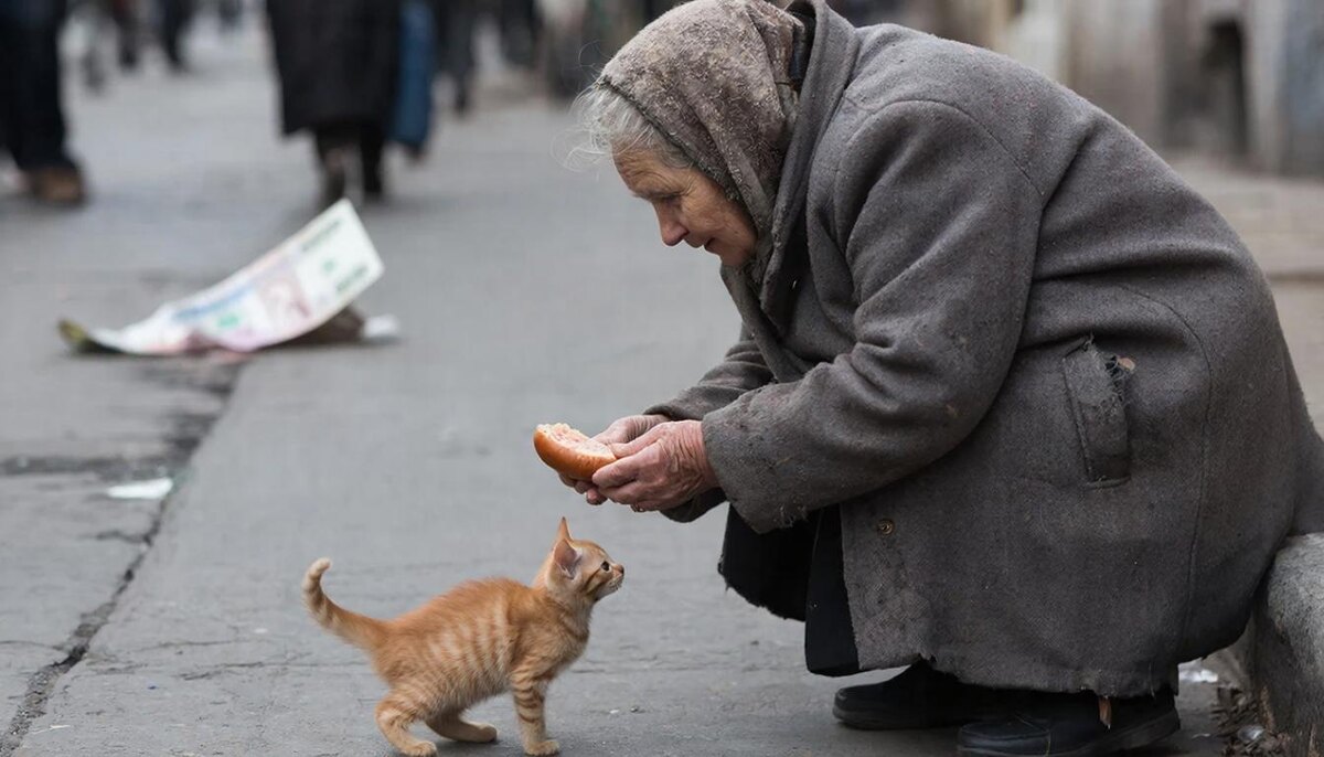 Дима молчал. Он смотрел на эту картину: старая женщина в убогом пальто, делящая одну сосиску на пятерых бездомных животных. Он вспомнил, как вчера кричал на мать за то, что ужин остыл. Вспомнил, как фыркал в магазине в очереди за такими же старушками. И впервые в жизни ему стало по-настоящему стыдно. Он вдруг увидел не «сумасшедшую бабку», а человека невероятной, непостижимой доброты.