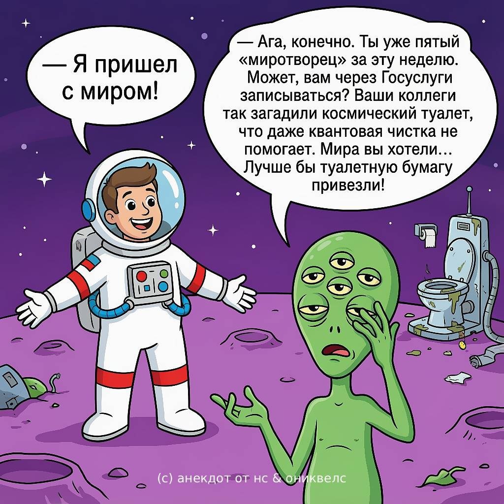 🛰🧑🚀👽🛸 Космонавт приземляется, широко раскинув руки перед инопланетянином: — Я прилетел с миром! Инопланетянин устало массирует все шесть глаз: — Ага, конечно. Вы уже пятый "миролюбец" на этой неделе. Может, запишетесь в очередь через Госуслуги? А то ваши коллеги космический сортир засрали так, что даже квантовая очистка не помогает. Мира захотел... Лучше бы туалетную бумагу привёз! (с) анекдот от нс & ониквелс