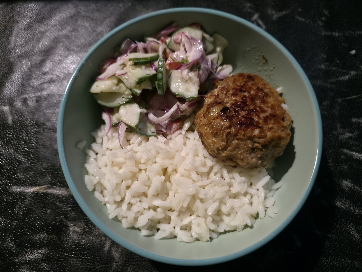 Блюдо вечера: рис, обжаренный на сливочном масле, свежий салат, котлета из свино-говяжьего фарша (с обжаренным луком и чесноком, сливочным