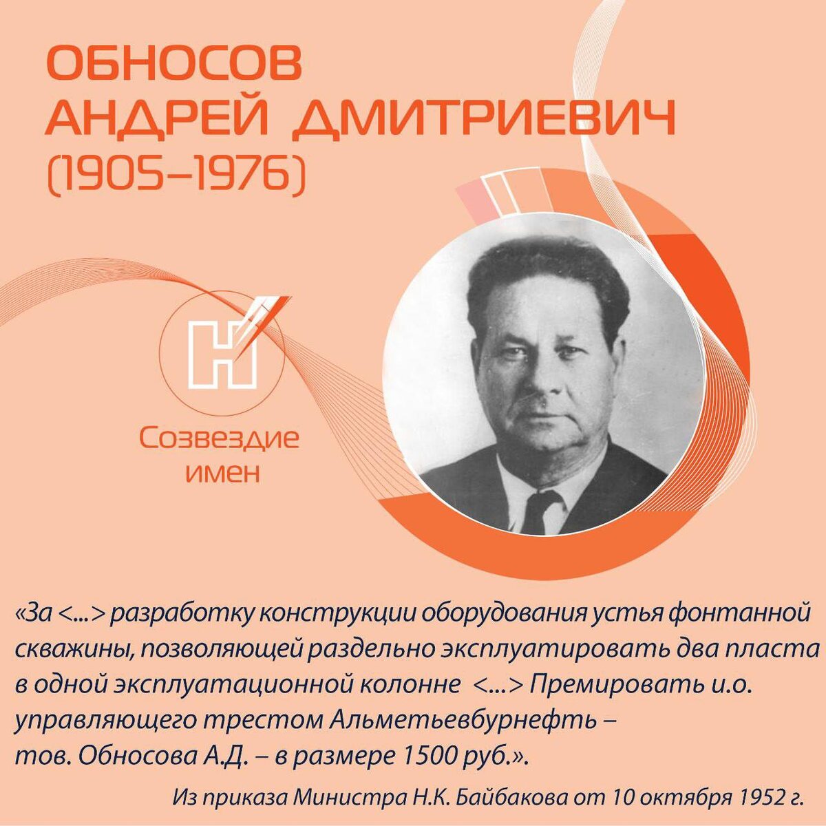 29 ноября 1905 г. родился инженер-нефтяник, крупный хозяйственный руководитель, внесший большой вклад в становление нефтедобывающей промышленности Урало-Поволжья Андрей Дмитриевич Обносов. Уроженец г. Баку, сын рабочего. В 1933 г. окончил Азербайджанский нефтяной институт с квалификацией "инженер-механик". С 1920 г. работал учеником слесаря, затем слесарем нефтеперегонного завода треста "Азнефть". После окончания института А.Д. Обносов - старший инженер, начальник отдела ГИИНмаша, директор механического завода им. Ф.Э. Дзержинского, начальник технического отдела завода им. Сталина. В 1939 - 1941 гг. - директор строящегося завода буровых инструментов в г. Куйбышеве. В 1941 г. - управляющий трестом «Востокнефтемаш» Наркомнефти. С 1942 г. - главный механик объединения «Башнефть». В 1947 - 1963 гг. - управляющий укрупненным нефтепромыслом "Бавлынефть", в 1948 г. директор конторы бурения, в 1950 г. - управляющий трестом "Бавлынефть". С 1952 г. - управляющий трестом "Альметьевбурнефть