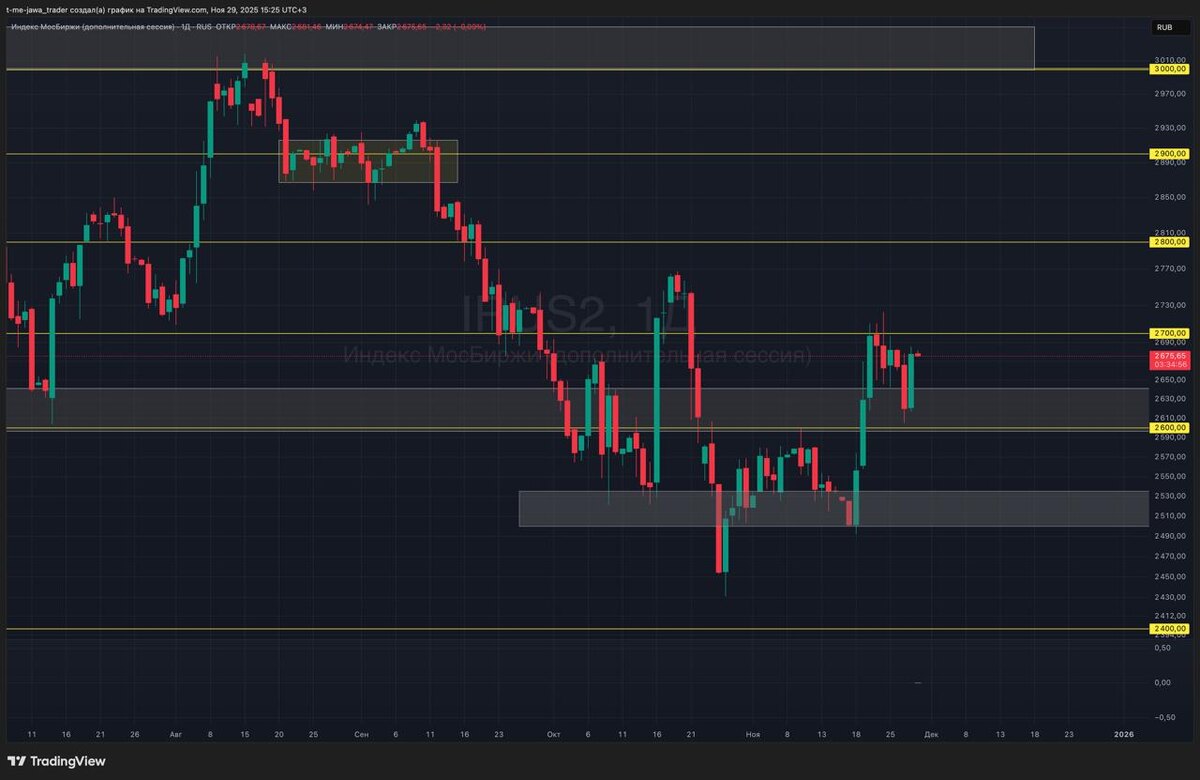 🗓 Итоги недели 24 ноября -28 ноября 2025 Всех приветствую! Неделя началась достаточно скучно, как и предполагалось, стояли в боковике. К концу недели покатали на горках, сперва вниз, потом вверх. Продолжают поступать по факту позитивные новости по геополитике. На следующей неделе ожидается встреча представителя США с Путиным и обсуждение мирного плана. Позитива добавляет продолжающийся коррупционный скандал на Украине. Определенно мир где-то близко. Но рынок продолжают держать, крайне непонятно, почему мы сильно ниже уровней переговоров в Анкоридже. Есть вероятность, что рынок могут держать до экспирации фьючерсов в декабре. Будем наблюдать, в таком случае нас может ждать мега ралли после экспирации. Индекс Мосбиржи 🇷🇺 $IMOEXF $MXZ5 $MMZ5 за неделю толком никуда не ушел. Необходимо пробивать отметку в 2700 и закрепляться над уровнем. Лучше рынка смотрится 🏦 $VTBR что радует. На следующей неделе будет интересно, наблюдаем. Всем хорошей недели и профита! 👉 Подпишись на Jawa Tr