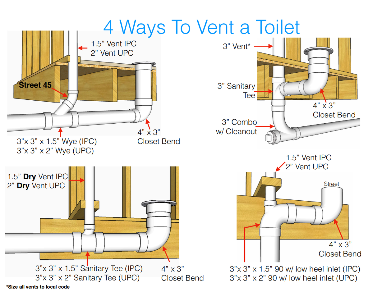 Как вам известно, минимальный размер сливной трубы для унитаза составляет 3". Половина от 3" дает нам 1,5" - это и есть размер вентиляции для унитаза. Данное правило основано на разделе 906.2 IPC.