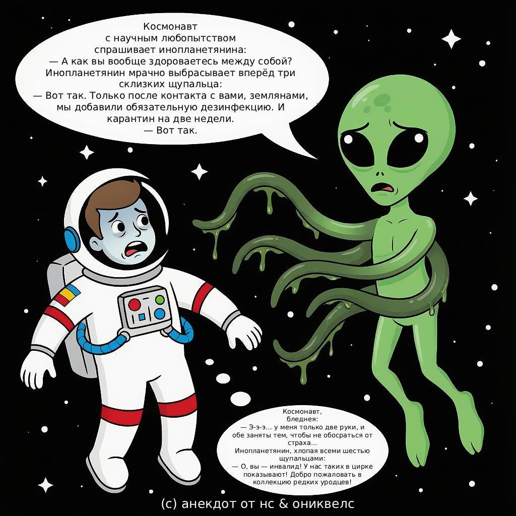 🛰🧑🚀👽🛸 Космонавт с научным любопытством спрашивает инопланетянина: — А как вы вообще здороваетесь между собой? Инопланетянин мрачно выбрасывает вперёд три склизких щупальца: — Вот так. Только после контакта с вами, землянами, мы добавили обязательную дезинфекцию. И карантин на две недели. — Вот так. Космонавт, бледнея: — Э-э-э… у меня только две руки, и обе заняты тем, чтобы не обосраться от страха... Инопланетянин, хлопая всеми шестью щупальцами: — О, вы — инвалид! У нас таких в цирке показывают! Добро пожаловать в коллекцию редких уродцев! (с) анекдот от нс & ониквелс