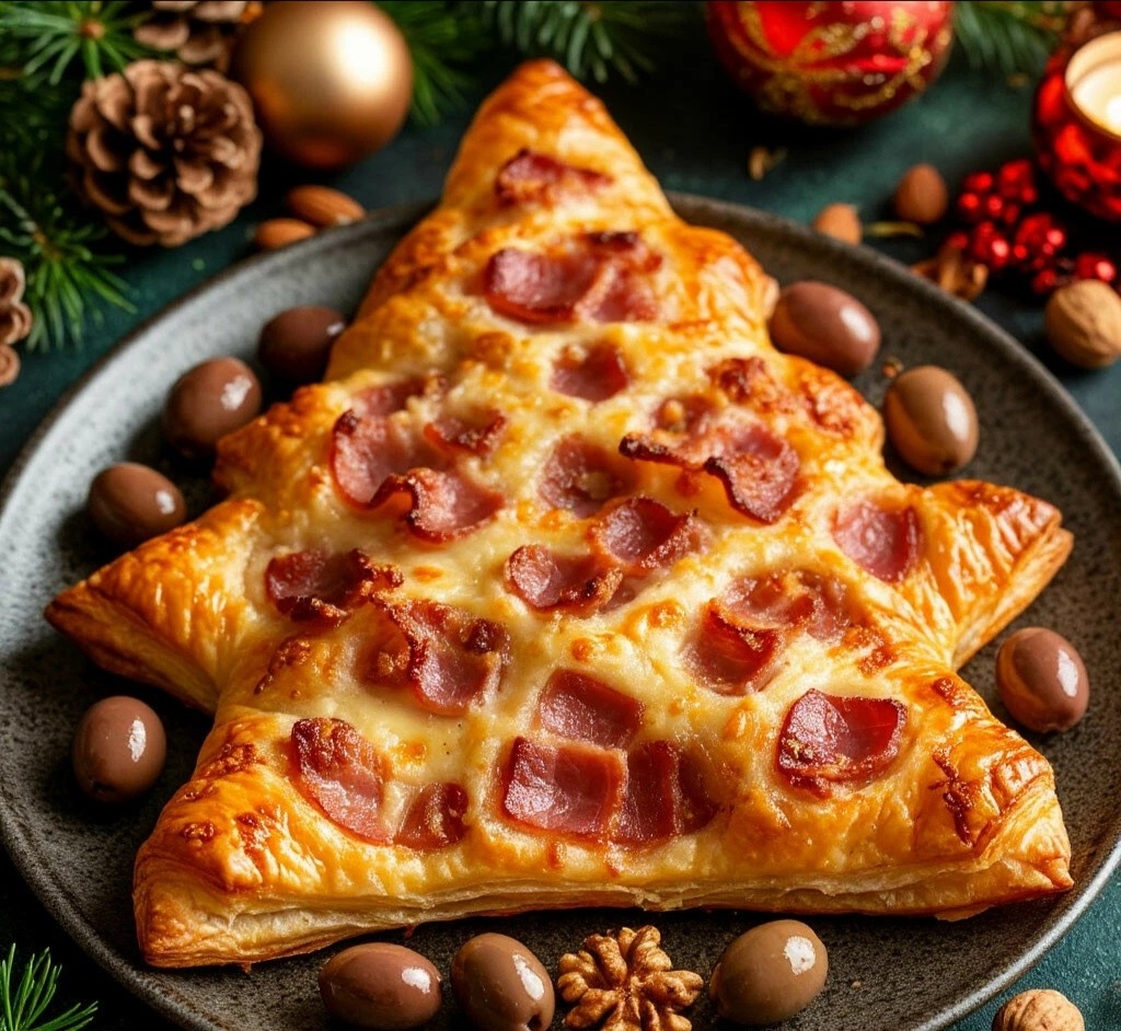 «ЕЛОЧНОЕ НАСТРОЕНИЕ» Мяу, мои пушительные создатели праздника! 😺🎄 А вот и главное украшение новогоднего стола — съедобная елочка из слоеного теста с сырно-беконной начинкой! Ароматная, хрустящая и такая праздничная — она создаст настроение еще до полуночи! ✨ «ЕЛОЧНОЕ НАСТРОЕНИЕ» ИНГРЕДИЕНТЫ: 🧾 · Слоеное тесто бездрожжевое: 1 упаковка (500 г) · Бекон: 150 г · Сыр (Чеддер, Гауда или Эдам): 150 г · Яйцо: 1 шт. (для смазки) · Кунжут, мак: для посыпки · Грецкие орехи, оливки: для украшения при подаче ВРЕМЯ ПРИГОТОВЛЕНИЯ: ⏰ 40 минут СЛОЖНОСТЬ:🐾 Есть над чем подумать ПОШАГОВАЯ ИНСТРУКЦИЯ: 👩🍳 1. Бекон мелко нарезать и обжарить до хрустящей корочки. Дать остыть. Сыр натереть на мелкой терке. Смешать бекон и сыр. 🥓🧀 2. Тесто раскатать в два больших прямоугольника. Каждый прямоугольник разрезать пополам вдоль, чтобы получилось 4 длинные полосы. На середину каждой полосы выложить начинку из бекона и сыра. Края теста защипнуть, чтобы получились длинные «колбаски» с начинкой внутри. 3