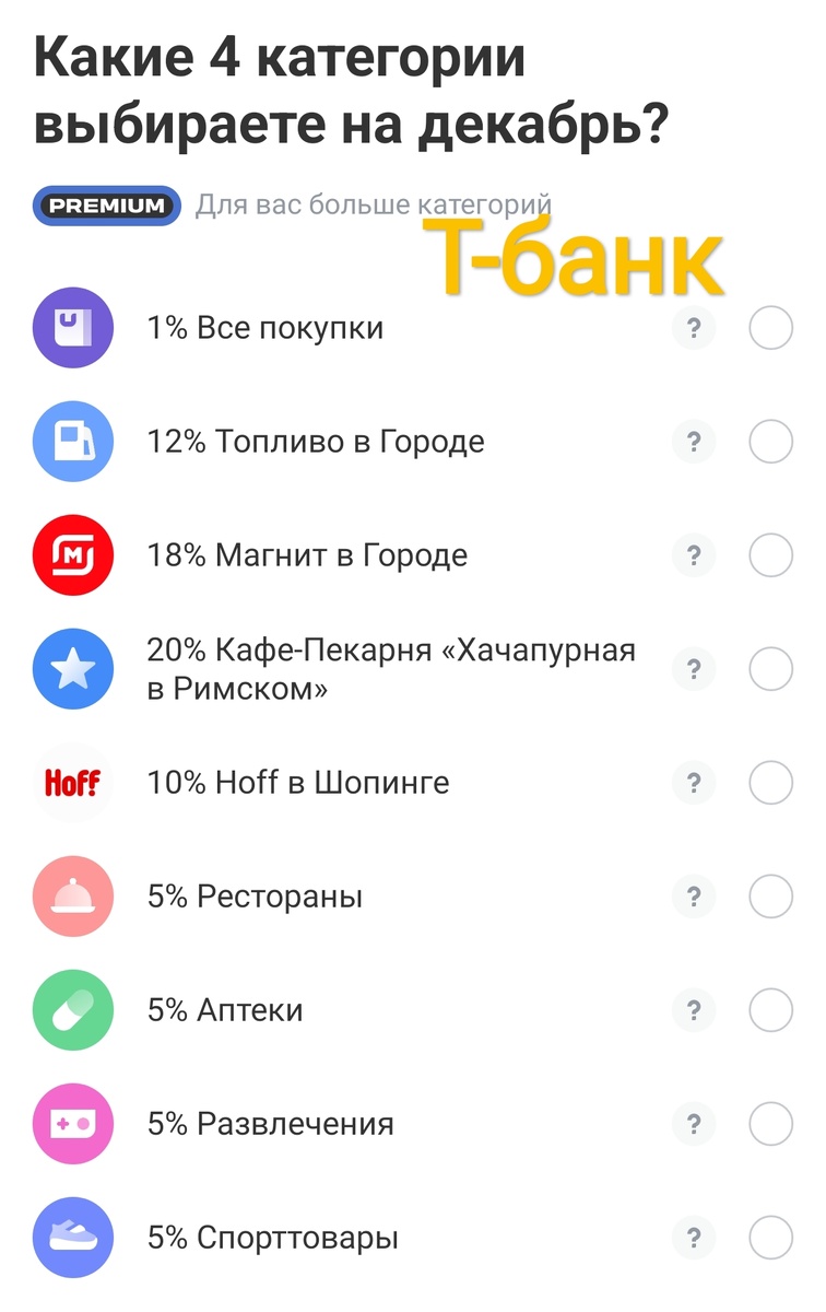 Привет всем 👋 Каждый месяц каждый, кто хочет вернуть себе хотя бы часть потраченных денег, садится и выбирает кэшбэк в банке/банках, где у него есть карты. Я точно сажусь и выбираю. Ещё и смотрю в конце месяца есть ли более выгодные категории в новом месяце или лучше что-то прикупить сейчас, пока месяц не закончился. Вы тоже так делаете? Я заметила, что сейчас банками всем клиентам предлагается разный кэшбэк. Рассмотрим, что дали мне. Карта Т-банка у меня вторая карта, которую я оформила. Первой была зарплатная от Сбербанка. Кэшбэк сейчас здесь не очень. Но я активно ей пользуюсь используя предложения по кэшбэкам у партнёров, кэшбэки дня и т п. Плюс использую брокерские счета, накопительные и вклады. По количеству использования за месяц, эта карта у меня чаще всего на первом месте. Удивила категория на кафе-пекарню. ☺️ Неожиданный вариант, верно? Альфа-банк каждый месяц что-то да меняет в выборе категорий Однозначно нужно воспользоваться 7% на одежду и обувь. Правда здесь не учит
