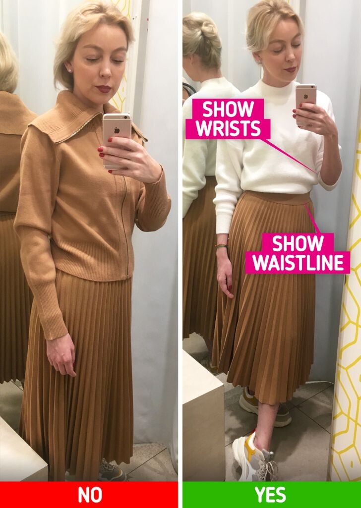 Когда мы смущаемся лишнего веса, мы часто пытаемся скрыться под слоями одежды, чтобы не привлекать внимания. Однако важно подчеркнуть такие области, как запястья, талия, шея или лодыжки. Подчеркнув эти черты, можно создать элегантный и стройный образ.