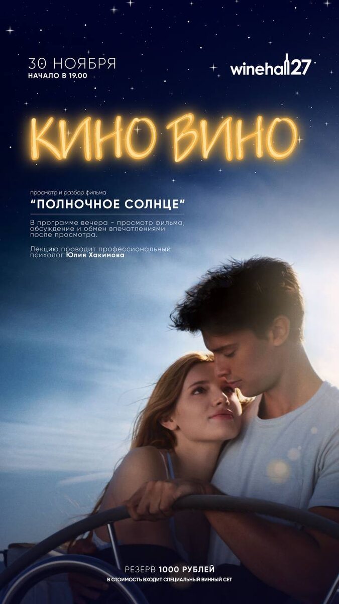 Киноразбор с психоаналитиком Юлией Хакимовой Фильм для анализа: «Полночное солнце» (2018) Дата и время: 30 ноября, 19:00 Локация: Music Hall 27 Приглашаем вас на интеллектуальный вечер, посвященный исследованию чувств и отношений через призму кинематографа. Психоаналитик Юлия Хакимова станет вашим гидом по лабиринтам эмоций, которые дарит картина «Полночное солнце». Стоимость участия: 1000₽. В цену включено: участие в дискуссии, и дегустация 4 бокалов вина. Количество мест строго ограничено. Для резервации просим звонить по номеру: +7 (347) 293 73 27 Будем рады видеть вас. До встречи! 🧡