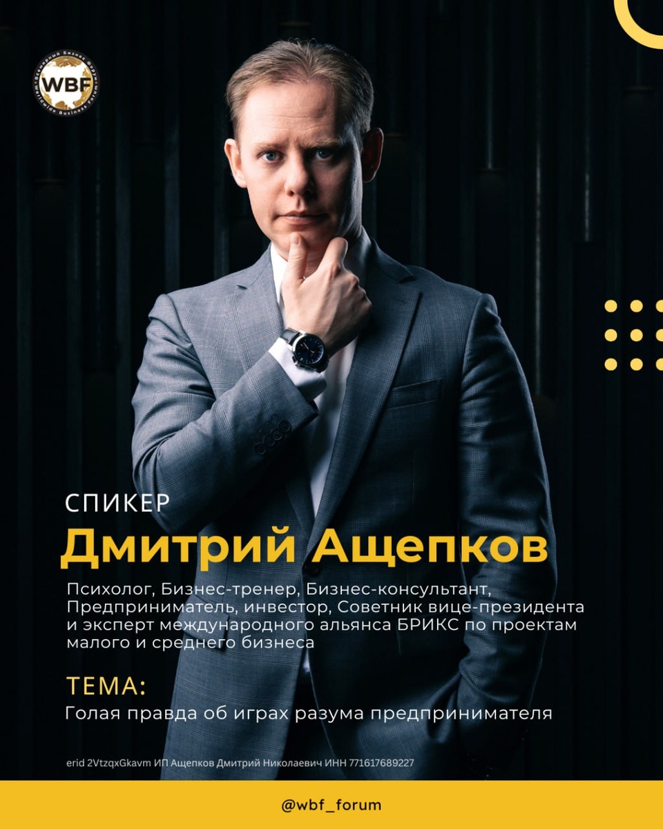 СПИКЕРЫ ВСЕМИРНОГО БИЗНЕС ФОРУМА 🎙 ДМИТРИЙ АЩЕПКОВ – Психолог, Бизнес-тренер, Бизнес-консультант, Предприниматель, инвестор. Советник вице-президента и эксперт международного альянса БРИКС по проектам малого и среднего бизнеса, Приглашенный эксперт Форумов, конференций и программ обучений. Автор книги и Игры "Триггер: руководство по поиску себя", Автор федеральных программ обучения для Минэкономразвития ➡️ ТГ канал https://dzen.ru/id/5e81957f8ccb2b5864348b2c ТЕМА: Голая правда об играх разума предпринимателя ********** 🎙 НИКОЛАЙ ЯГОДКИН - Специализируюсь на повышении эффективности работы мозга, навыках самообучения и изучения языков. Создал компанию и развил её до полумиллиардного оборота (в 2021 году — в ТОП-5 онлайн-школ РФ). Вывел государственную областную общеобразовательную школу (без отбора детей) в ТОП-100 школ РФ (из 40 000). Среди корпоративных клиентов: Сбер, ВЭБ.рф, АФК «Система», Альфа-Банк, Сибур, Парламент Казахстана, ОТП Банк, Летово, Неохим, Газпром. Написал две к