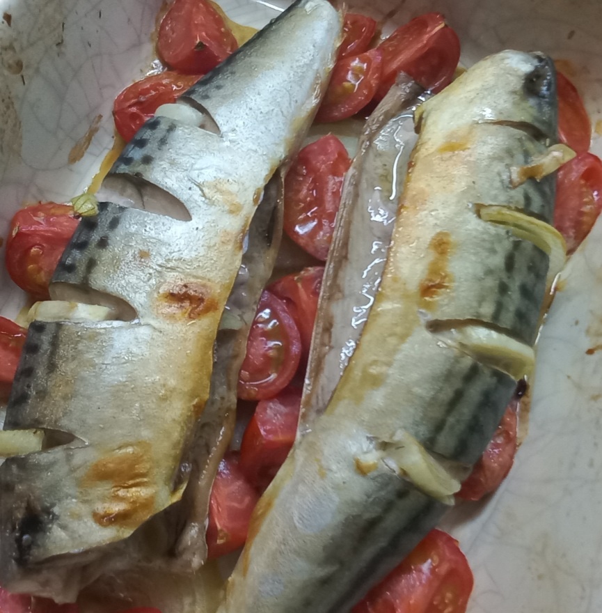 Скумбрия в горчичном соусе, запеченная на овощной подушке