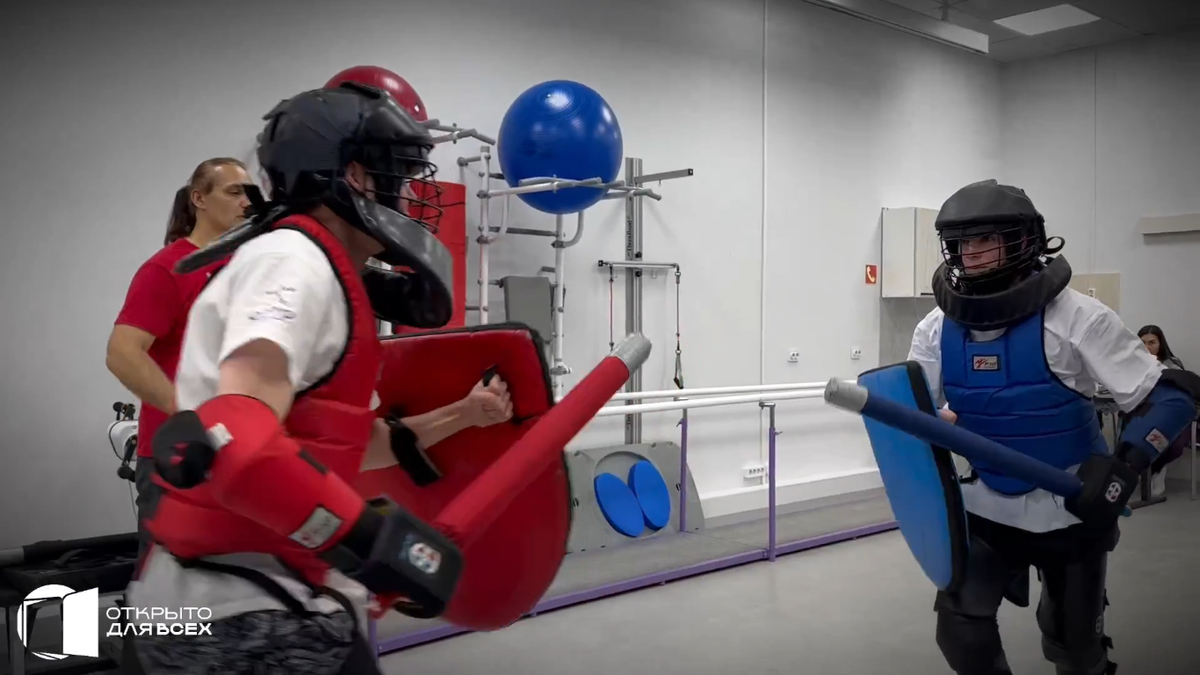 Мастер-класс «Мечевой бой, как способ реабилитации» был проведен для пациентов центра протезирования. Современный мечевой бой был организован в рамках Всероссийской недели «Открыто для всех». Во время него спортсмены применили технику фехтования, воссозданную на основе приемов обращения со средневековым клинковым оружием. Данный вид единоборства улучшает координацию и навыки передвижения, повышает мышечный тонус и общую физическую активность. Фото: скриншот видео, размещенного на странице ВК центра протезирования.