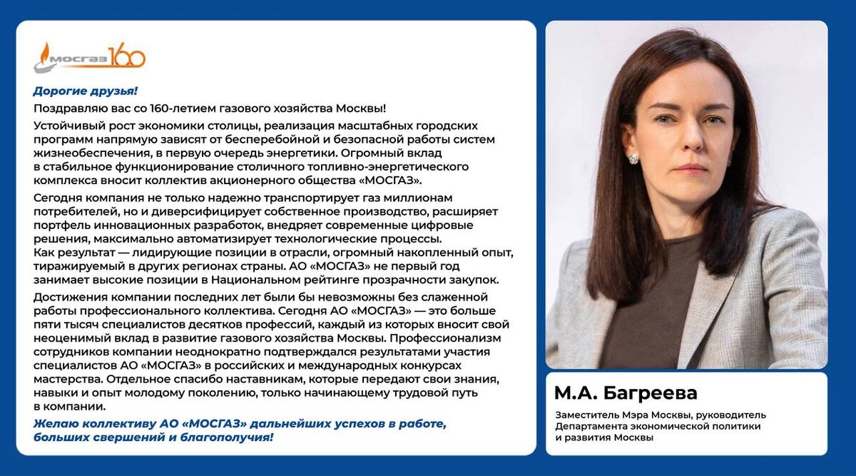 Поздравление Заместителя Мэра Москвы, руководителя Департамента экономической политики и развития Москвы Марии Андреевны Багреевой в адрес коллектива газового хозяйства Москвы со знаменательной датой. 🔜 Больше теплых слов читайте на сайте. #ГазовомуХозяйствуМосквы160 @aomosgaz