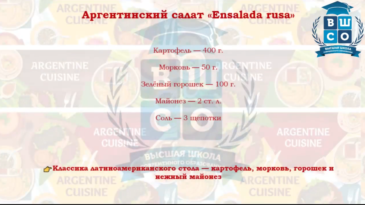 В мире здорового питания часто встречаются устоявшиеся мифы. Один из самых главных: «майонез — это зло». Но так ли это на самом деле, когда мы говорим о сбалансированном подходе к еде? Сегодня разберемся на примере настоящей звезды латиноамериканского стола — аргентинского салата «Ensalada rusa» (Энсалада руса). Этот салат — далекий и очень вкусный родственник нашего знакомого «Оливье». В Аргентине его подают в каждом доме, на каждом празднике и семейном ужине. Он невероятно популярен благодаря своему нежному вкусу и сытности. Рецепт классического аргентинского «Ensalada rusa» Ингредиенты (на 4-6 порций): Приготовление: Впрочем, можно обойтись и без яиц. Посмотрите, как готовит такой салат Елена Нелюбина в проекте "КухняПросто" Почему же «Ensalada rusa» — это здоровое питание? Да, в рецепте есть майонез. Но давайте посмотрим на блюдо в целом и развеем мифы! 1. Основа — это мощный витаминный заряд.