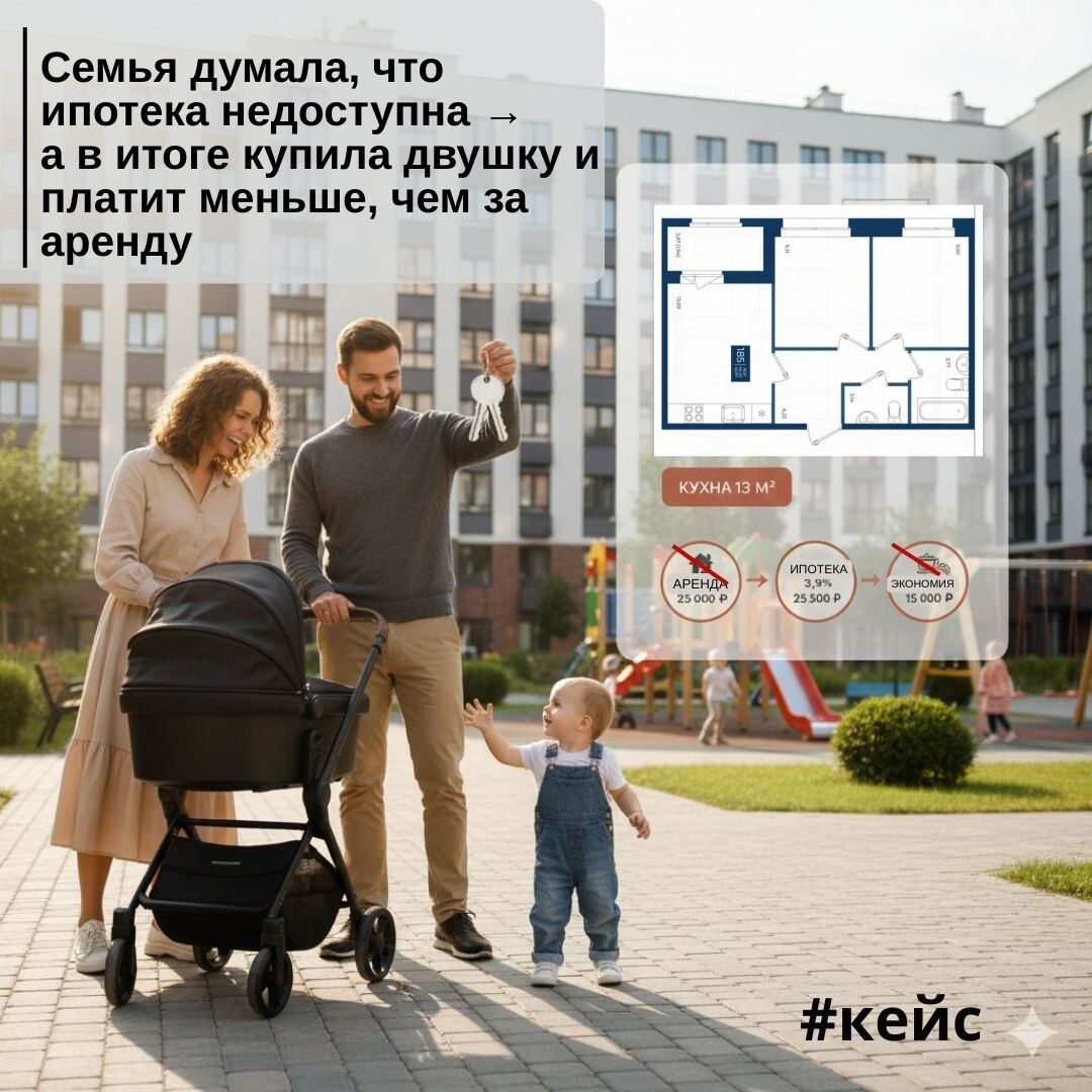 Ребёнку меньше года, работает только один супруг, супруга в декрете. Финансовая картина была такой: Потребительский кредит → платёж 26 000 ₽ Аренда квартиры → 25 000 ₽ Итого ежемесячная нагрузка → 51 000 ₽ И при этом — ни уверенности в одобрении, ни понимания, какую квартиру они могут себе позволить. На консультациях звучали типичные убеждения: «Мы не подходим под ипотеку» «Про двушку можем даже не мечтать» «Если платёж будет 60–70 тысяч — мы не вывезем» ⭐ Формирование приоритетов Мы начали не с поиска квартиры, а с формирования картины жизни: рядом с родителями — дорого, даже однушку не потянули бы; другие районы — нет подходящих небольших двушек; в некоторых локациях не подходили детские учреждения; Семья поставила приоритет: 👉 Главное