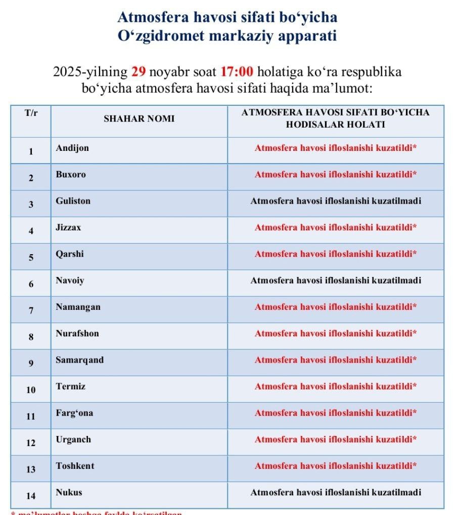 Бугун 17:00 ҳолатига кўра, республикамиз бўйича Гулистон, Навоий ва Нукусдан бошқа барча ҳудудларда атмосфера ҳавоси ифлосланиши кузатилди