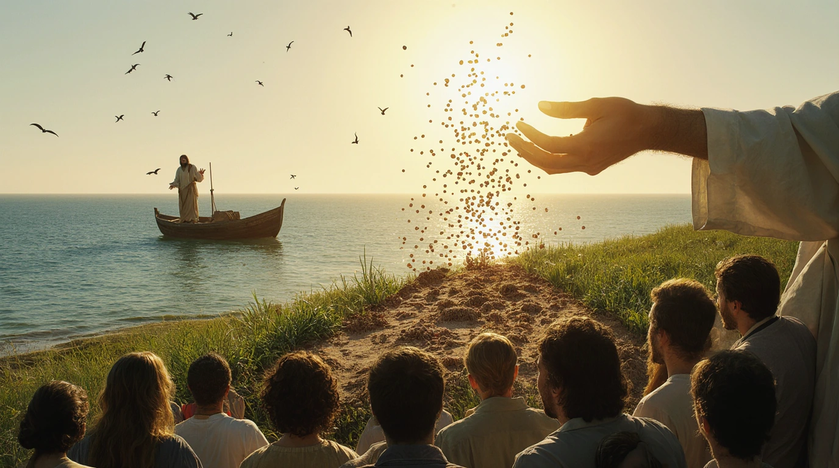 Страсти в доме утихли, и на смену им пришли простор и свежесть Галилейского моря. Иисус снова начал учить у моря. К Нему собралось так много народа, что Он сел в лодку и говорил с берега, а слушатели толпились на зелёном склоне. В лодке, окружённой тихо плещущимися волнами, Иисус нашёл идеальную кафедру. В тот день, глядя на разные лица, полные ожиданий, Он изменил свой способ обучения. Он начал говорить притчами. Он обратил внимание слушателей на то, что их окружало — на распаханные поля, спускающиеся к самой воде. Его слова превратили привычный труд земледельца в рассказ о вечном. «Слушайте. Вышел сеятель сеять.» Перед людьми развернулась священная драма, разделённая на четыре акта, — драма слова Божьего и человеческого сердца. «Иное упало при дороге, и птицы поклевали его.» Бесплодная земля у края поля символизировала сердце, не готовое принять слово, которое легко становится добычей сатаны. «Иное упало на каменистое место. Оно быстро взошло, но когда взошло солнце, увяло и засох
