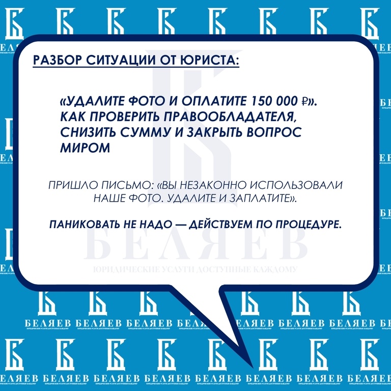 📨 «Удалите фото и оплатите 150 000 ₽». Как проверить правообладателя, снизить сумму и закрыть вопрос миром 🟦 Сценарий Пришло письмо: «Вы незаконно использовали наше фото. Удалите и заплатите». Паниковать не надо — действуем по процедуре. 1) 🔎 Проверяем, кто пишет Юрлицо/ИП/агент? Требуйте доказательство прав: договор отчуждения/лицензия/регистрация/исходники/EXIF. Сверьте объект и период использования (точные URL, даты). 2) 🧪 Быстрое снижение рисков Удалите/замените спорный контент (зафиксируйте факт: скрин до/после, время). Проверьте, нет ли онлайна в кэше/дублях (сайты, соцсети, рассылки). Соберите свои доказательства права: стоковая лицензия/договор с автором/переписка. 3) 🗣 Ответ-фиксация (в течение 2–3 дней) «Получили обращение по изображению/видео (ссылка). Контент удалён/заменён. Просим предоставить подтверждение прав и расчёт суммы с обоснованием. Готовы к урегулированию.» 4) 💸 Переговорная вилка Если нарушение было — просите лицензионное урегулирование (ретр