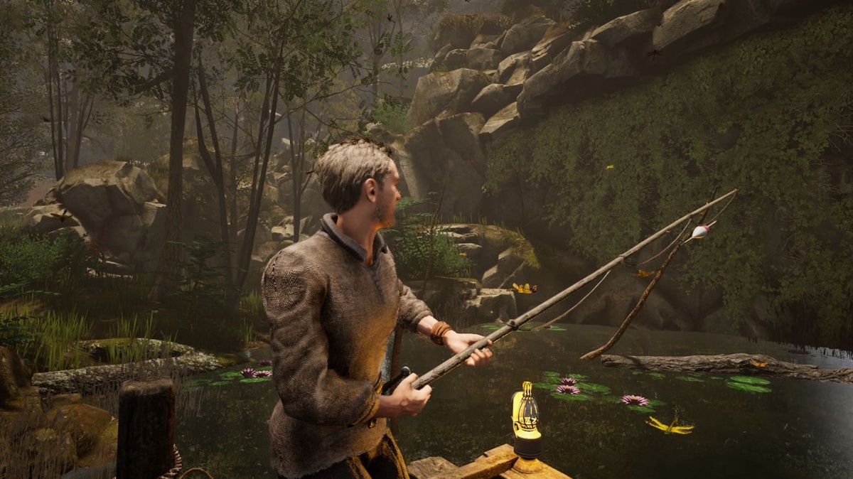 Отыщите специально оборудованное место у водоема, так как удочки являются стационарными объектами и не попадают в инвентарь. Взаимодействуйте со снастью, дождитесь звука всплеска для подсечки и аккуратно подматывайте леску, пока индикатор успеха не станет зеленым. Главная особенность местной рыбалки заключается в том, что персонаж не носит удочку с собой. Снасти всегда находятся на берегу, рядом с ящиками для наживки. Первая такая точка расположена слева от выхода из хижины Нереста. Подойдите к лежащей удочке и нажмите кнопку действия. На экране отобразятся две шкалы: состояние лески и вероятность успешного вываживания. Управление процессом зависит от используемого устройства. Успех зависит от таймингов. Внимательно слушайте окружение: как только раздастся звук «плюх», делайте одиночное нажатие для подсечки. Когда леска начнет натягиваться, удерживайте кнопку подмотки. Пойманная рыба имеет несколько вариантов применения, поэтому не спешите от нее избавляться. Финальное действие, вытас