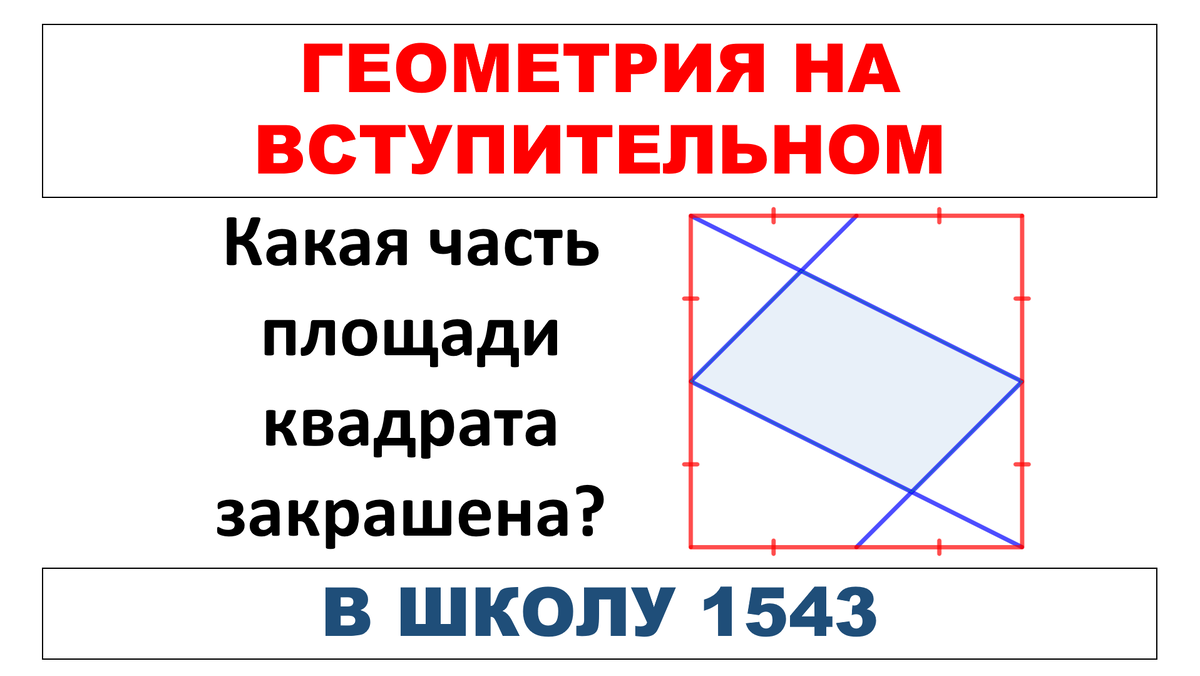 Большая часть моих учеников, которых я готовлю к вступительным экзаменам в школу 1543, поступают в 5 класс, но есть и те, которые нацелены на приём в старшие классы. На занятиях с ними мы учимся решать любопытные задачи из экзаменов прошлых лет. Вот, например, попробуйте решить задание по геометрии, которое было в варианте по математике при поступлении в 10 математический класс. Какая часть площади квадрата закрашена? Введём следующие обозначения на рисунке: Пусть площадь всего квадрата равна 1. Тогда площадь треугольника ABC равна 1/4, поскольку он занимает четвёртую часть от всего квадрата. Будем искать площадь треугольника AOC, потому что она равна половине искомой площади всего закрашенного четырёхугольника. Заметим сперва, что треугольника BOD подобен треугольнику AOC по двум углам (∠BOD = ∠AOC, так как они вертикальные, а также ∠BDO = ∠OAC, так как они накрест лежащие при параллельных прямых BD, AC и секущей AD). Тогда верно следующее соотношение подобия: Заметим теперь, что