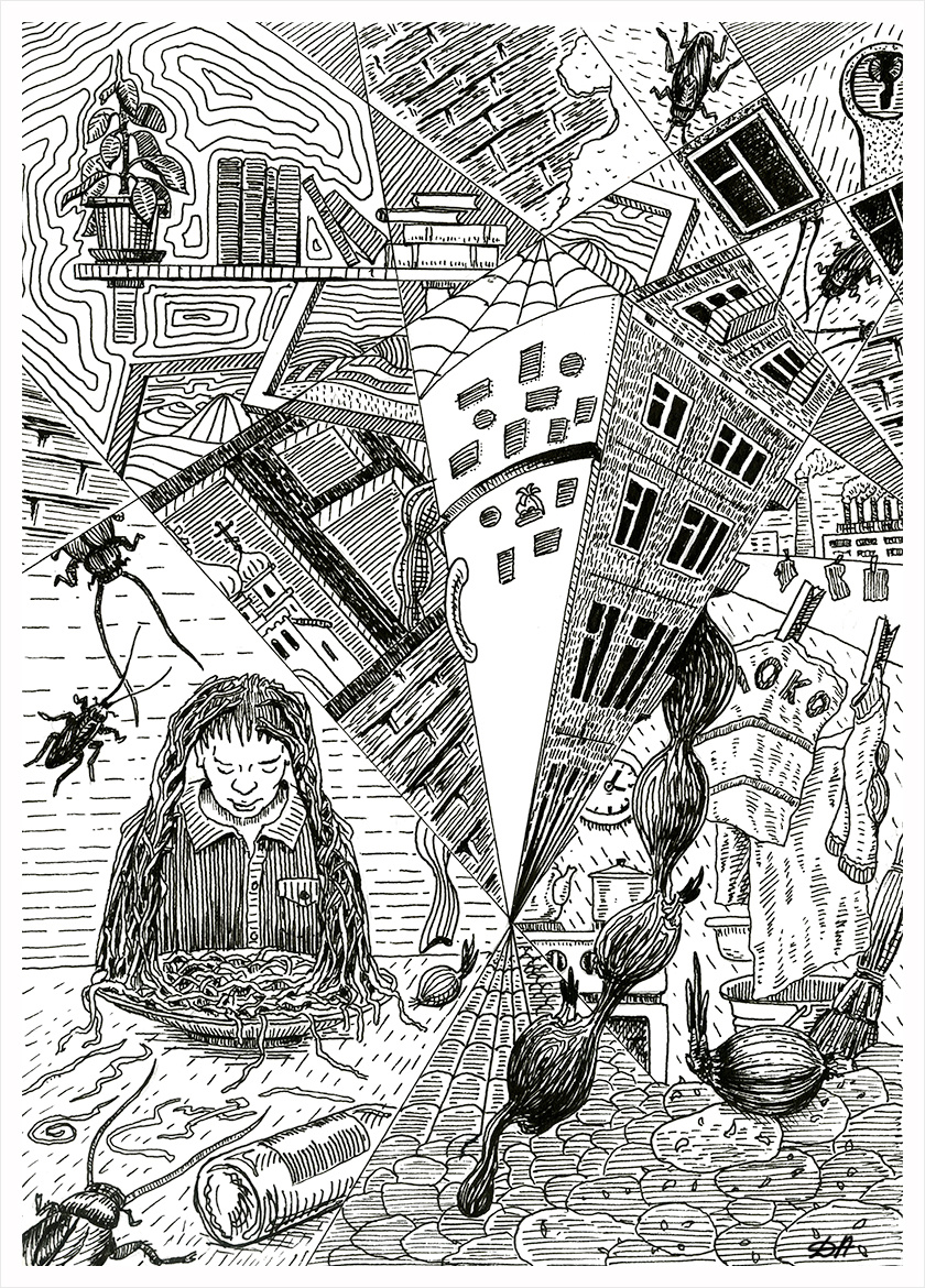 Однажды я проникся рассказом моего знакомого писателя, о мальчике, который залил Доширак водкой. Рассказ меня так впечатлил, что я нарисовал вот эту иллюстрацию.