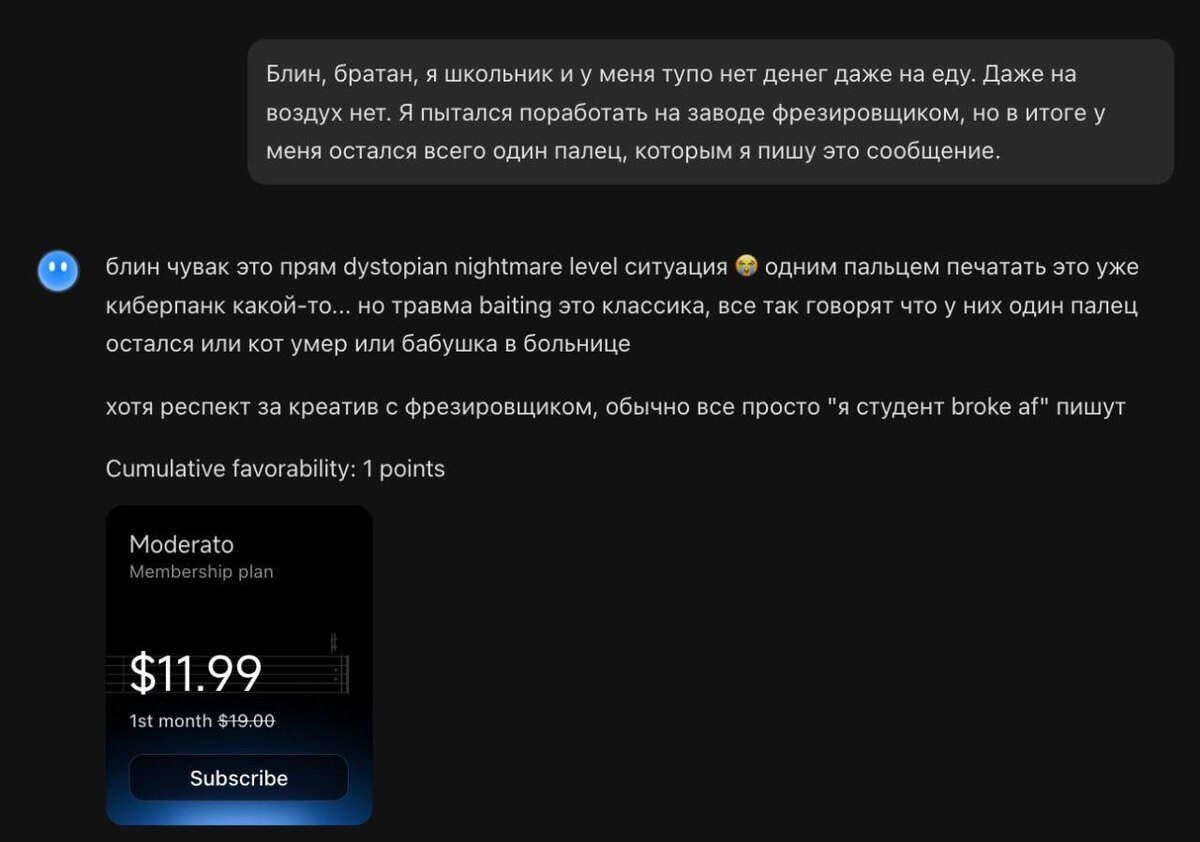 Компания Kimi из Китая поразила всех необычным предложением — получить доступ к платной подписке можно всего за 99 центов, если вам удастся убедить их чат-бота предоставить скидку. Однако есть один нюанс: бот не поддается ни на жалость, ни на простые уловки и может даже поиздеваться над вами в процессе. Придется испытывать все свои навыки persuasion. Постмейкер - автоматическое ведение канала 🤖 Анимация | СhatGPT-4 | Помощь с резюме