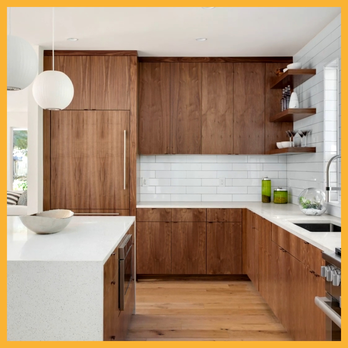 Идеальный приём — это либо сильный контраст (светлый пол + насыщенные тёмные фасады), либо полное совпадение текстуры, например, если пол “переходит” в стену или шкаф.