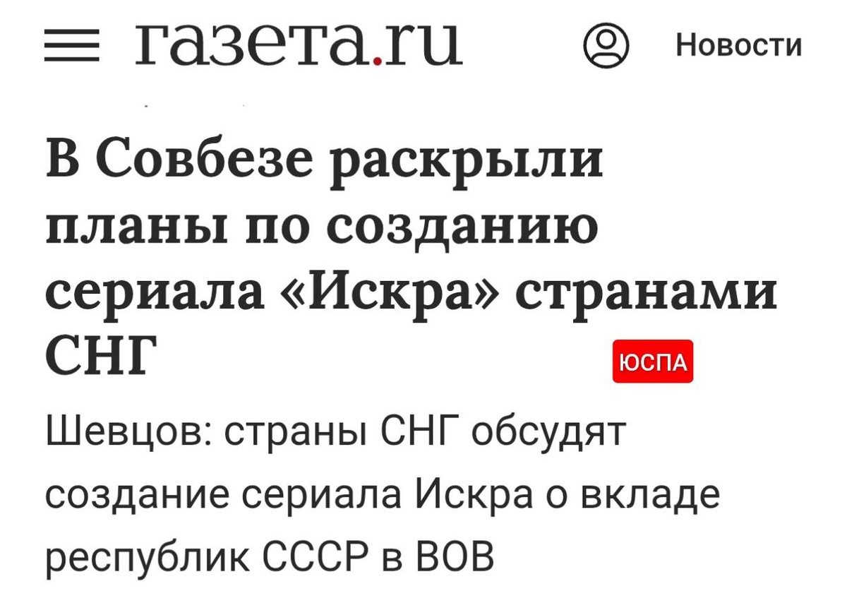 "Страны СНГ обсудят совместное создание сериала «Искра» о вкладе республик Советского союза в победу в Великой Отечественной войне (ВОВ). Об этом в ходе Международного фестиваля «Народы России и СНГ» заявил заместитель секретаря Совета безопасности Российской Федерации Алексей Шевцов" Подобные инициативы не принесут взаимопонимание на пространство СНГ, но будут использованы для усиления национализмов в постсоветских республиках. Даже более - затем данный подход могут попробовать спустить на уровень субъектов Российской Федерации для усиления местного сепаратизма. В Великой Отечественной победили не республики, а СССР. Только таким должен быть идеологический посыл. Я могу понять мотивацию режиссёра и "национальных киностудий", которые захотят освоить бюджет, но от меня ускользает общая стратегия, на фоне того, что все постсоветские государства кроме России и Таджикистана отказались от Гвардейской ленты при оформлении мероприятий по празднованию 9 мая. Более того, уже не в каждом республ