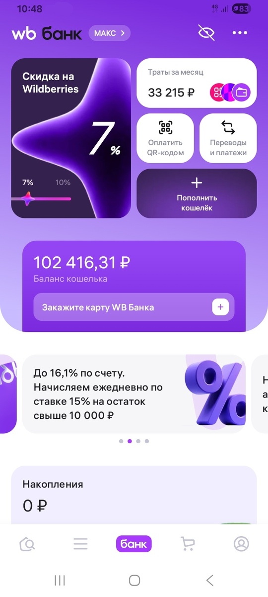 Как же я люблю экосистему вайлдберриз! Не прошло и месяца с момента, как писал про WB курьер и вот снова здравствуйте! На сей раз я повелся на ставку в 15% годовых на остаток и перекинул в WB "банк" 100 т.р. через СБП: При этом совсем забыл, что мне нужны деньги на еду и проезд прямо сейчас и решил перевести небольшую сумму обратно через СБП, но..... Обратился в поддержку, там как и ВБ курьер никто ничего не решает: Передали обращение в какой-то там профильный отдел и на след. день ничего не изменилось. Пытался вернуть деньги путем пополнения счёта др. банка, но увы и это не получалось: В течении дня я периодически заходил и пытался снова и снова перевести себе деньги, хотя бы чуть-чуть, т.к. у меня вообще денег не было. Я перевел все свои деньги туда! В какой-то момент получилось вывести 1000 рублей и я начал просто бесконечно пытаться перевести ещё! С 150 попытки получилось перевести ещё 5000 рублей, спустя время ещё 2000 рублей и наконец....чудом вывел всё остальное: Какое облегче