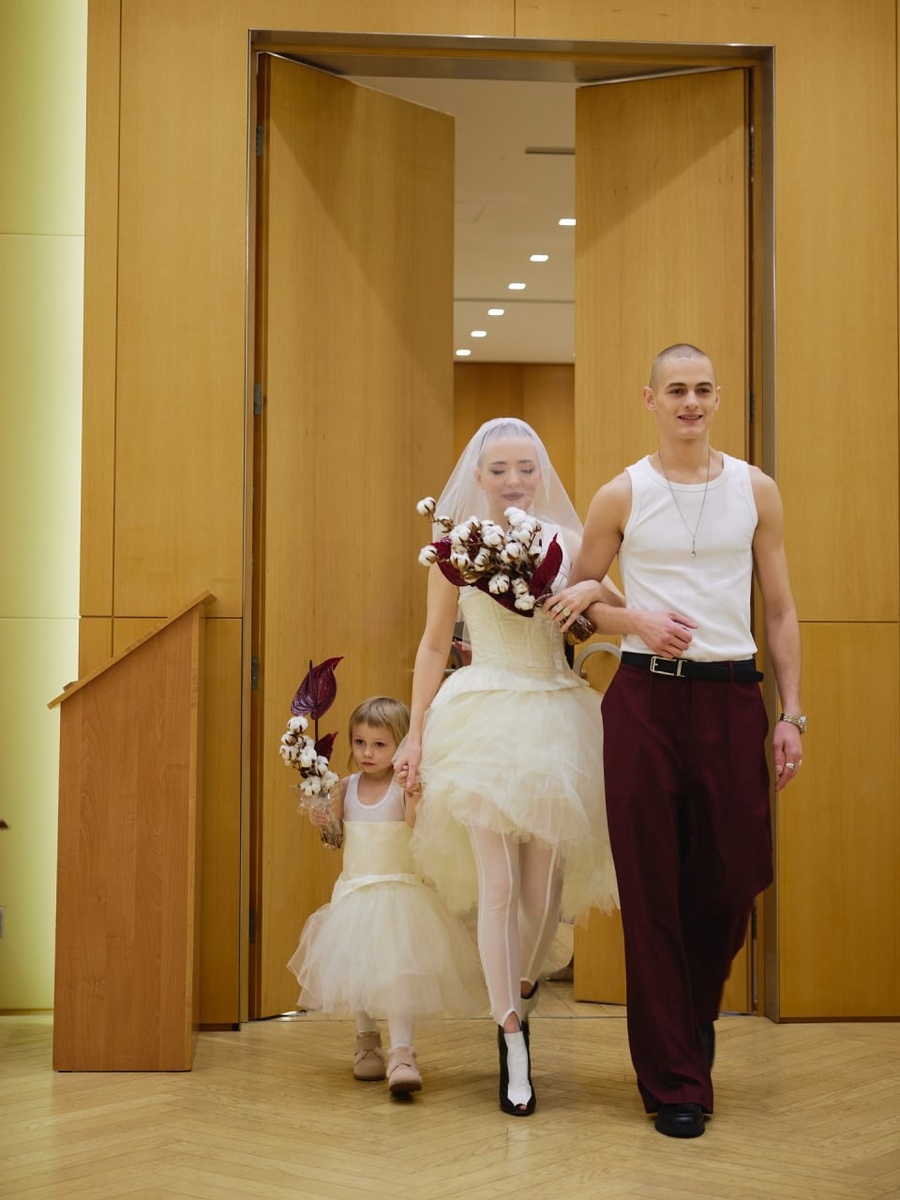 С ними была дочь Авдотьи, которую тоже одели в похожей стилистике, так что получился семейный лук без попытки выглядеть как открытка из салона свадебных платьев. И вот тут у меня включается внутренний стилист и внутренний человек одновременно, и они не могут прийти к единому мнению. Потому что с одной стороны хочется сказать, что это странно, а с другой стороны это честно, цельно и даже красиво