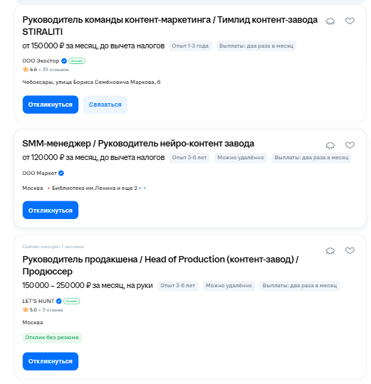 Компании готовы строить целые системы производства контента и нуждаются в тех, кто этими системами управляет. Они делают ставку на стратегическое руководство и автоматизацию через ИИ, промпт-инженерию, интеграции типа N8N.