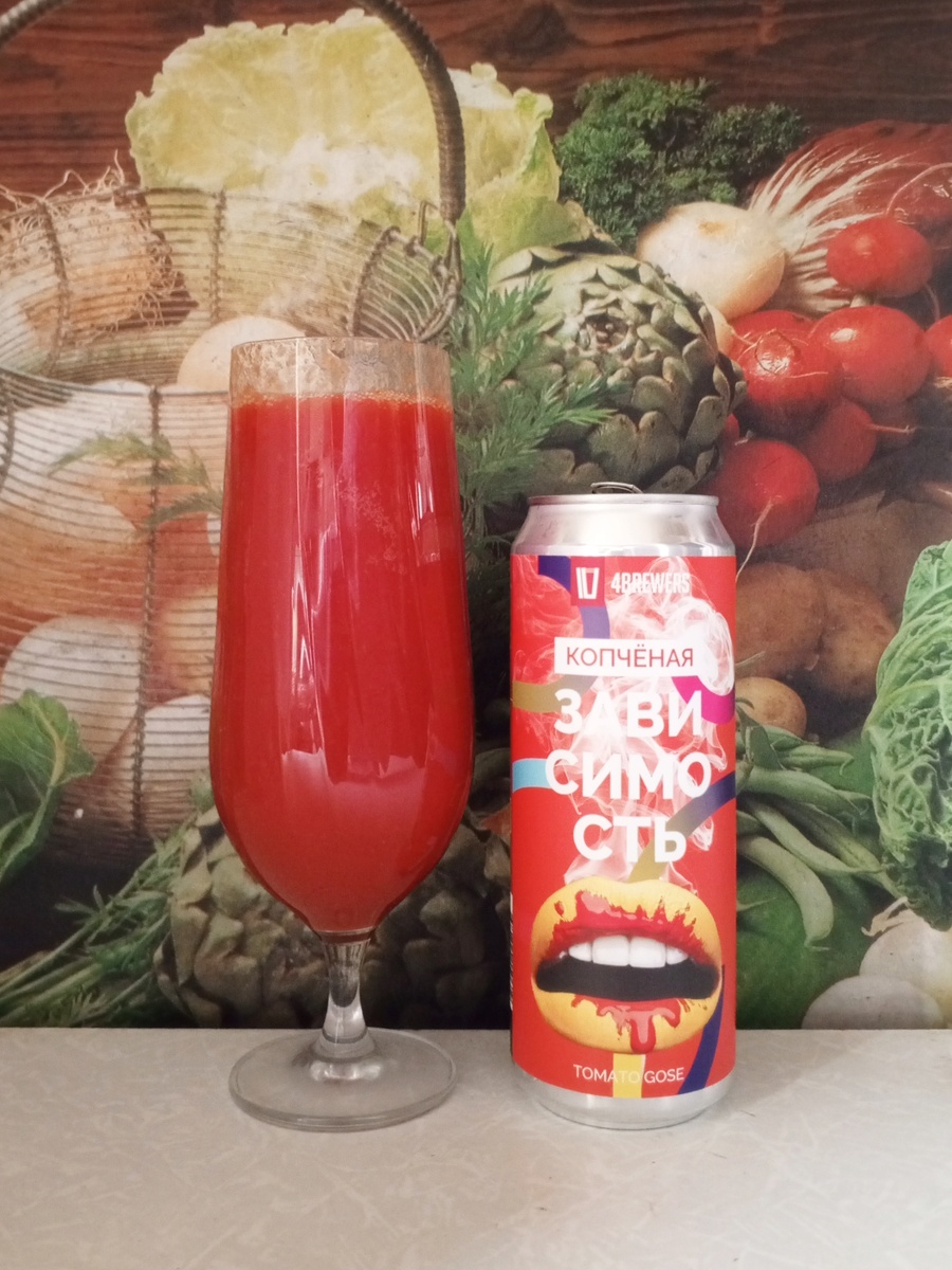 Пополнение в линейке "Зависомость" от "Четырёх пивоваров" из Владимира. "Зависимость" [Копчёная] От одной дозы ничего не будет. Смело наливайте бокал. Вряд ли вам захочется повторить это завтра. А уж тем более послезавтра. Ну, может быть, только по пятницам. Вы совершенно свободны от всяких условностей. Если захочется, всегда можно сделать это украдкой. И возьмите салфетку, у вас что-то красное на губах. Насыщенный светлый кислый эль. Сочные томаты, чуть соли, немного базилика, лавровый лист, чёрный перец, сушёный чеснок, кориандр и выраженный яркий вкус копчёного солода. Пивной напиток непастеризованный нефильтрованный неосветленный Состав: вода подготовленная (исправленная), солод пивоваренный ячменный, солод пивоваренный пшеничный, томатная паста, лактоза, соль поваренная пищевая, базилик сушёный, паприка, кориандр сушёный, чеснок сушёный, перец душистый, лавровый лист, хмель прессованный, дрожжи пивные, консервант сорбат калия (Е202). Объем: 0,45 л. Изготовитель: ООО "Четыре пиво