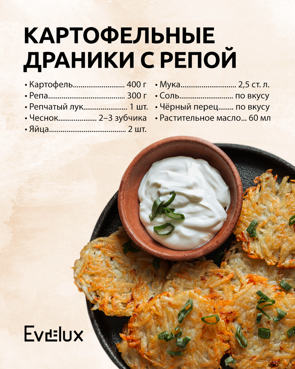 Вы когда-нибудь пробовали картофельные драники с репой? Хрустящая золотистая корочка снаружи и нежная, сочная сердцевина внутри раскрывают сладковатый вкус репы и насыщенный аромат картофеля. Чтобы добиться идеальной корочки, воспользуйтесь индукционной варочной панелью Evelux EI 6044: мгновенный нагрев и точный контроль температуры обеспечивают равномерное приготовление каждого драника. Больше о модели можно узнать по ссылке: https://clck.ru/3QMjNF