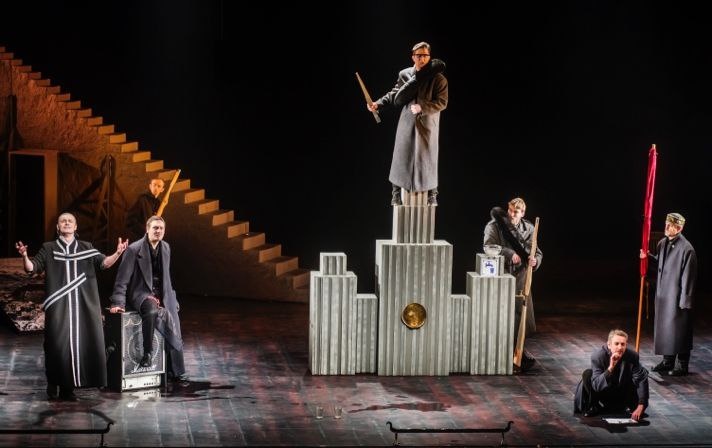 «Борис Годунов» (2015) Национальный драматический театр Литвы Режиссёр: Эймунтас Някрошюс В ролях: Сальвиус Трепулис, Мариус Репсис, Повилас Будрис В мире, придуманном Някрошюсом, совсем нет жизни. Темно, краски сгущены. Есть только удушающая тоска, от которой невозможно избавиться. Дышать в этом мире слишком тяжело. Сцена оформлена лаконично. Центром композиции режиссёр сделал лестницу, идущую вверх. На протяжении всего спектакля метафоричная конструкция будто напоминает, что история, описанная Пушкиным, существует вне времени и пространства, и играет разные роли, обретая новые смыслы. А у актёров нет ни одного лишнего движения или слова. При этом их игру невозможно назвать сухой. Особенно работу актёра Сальвиуса Трепулиса, исполняющего роль Годунова. Его герой – человек несчастный, понимающий, что ноша слишком тяжела. Он не может себя простить, а потому не может жить. Смерть же кажется неким выходом.