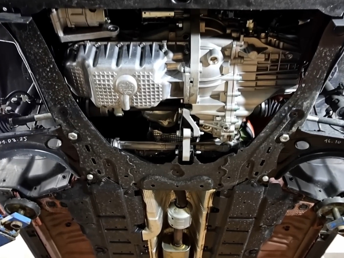 Подрамник здесь оригинальной конструкции - стальной, никакого алюминия. Форма у него необычная, трапецевидная, с огромным пространством для силового агрегата и шестью точками крепления. Некоторые крепления выглядят весьма оригинально - взять хотя бы боковой кронштейн.