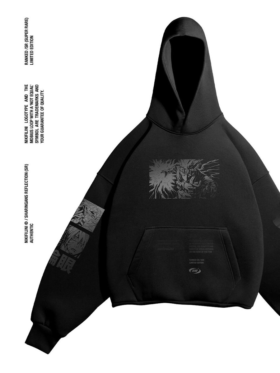 SHARINGANS REFLECTION (SR) Свежее прочтение легендарного COPY NINJA, посвященное одному из наших любимых персонажей Какаши Сенсею Дизайн теперь строже и взрослее: монохром, цельно, холодно, собранно. Рефлектив добавляет принту холодный металлический отклик — тихий в тени, резкий под вспышкой.