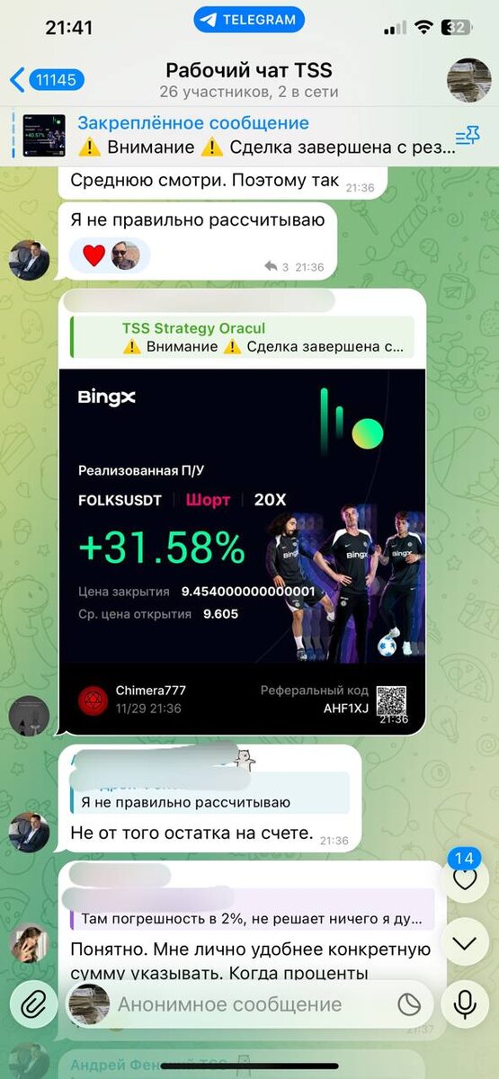 #результаты #tssoracul Сегодня все снова отлично поработали и провели удачную сделку по алгоритму TSS +41% Всех кто принял участие с профитом 😎✅✌🏼 Результаты прикрепляю😎 Бонусы от BingX 👈