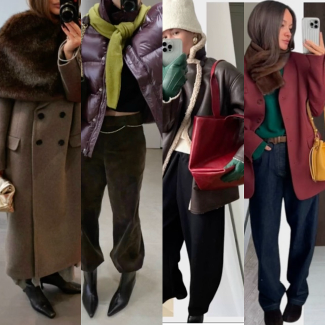 В осенне- зимнее время у нас нет такого разнообразия средств выразительности, приемов в гардеробе и количества верхней одежды, поэтому расскажу о том что поможет в стилизации комплектов: Посмотрите как выглядит на фото образ слева и справа несколько других вариантов, где есть разные фактуры ткани: кожа, мех, пушистый трикотаж. Этот простой приём может сделать и вывести Ваш стиль на новый более интересный и сложный уровень. В холодное время года, мы интуитивно выбираем более глубокие и темные оттенки одежды и на мой взгляд, они действительно выглядят не только универсально и практично, но уютно и дорого. Обратите внимание на оттенки коричневого: шоколад, кофе, корица, то что мы так любим особенно зимой. Так же многим колоритам подойдут и хаки, бордовый , фиолетовый, бирюзовый. Не забывайте, что колорит можно легко определить и узнать что в портретной зоне будет подчеркивать вашу красоту, и скрывать маленькие недостатки. Цветовой акцент в осеннем и зимнем гардеробе, будет очень инт