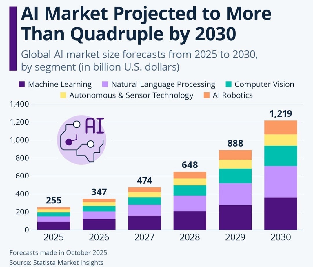 Мировой рынок искусственного интеллекта идёт в разгон, к 2030 году индустрия вырастет более чем в четыре раза — с $255 млрд в 2025-м до $1,2 трлн. Причём рост идёт сразу по всем сегментам — от машинного обучения и NLP до робототехники и автономных систем.
