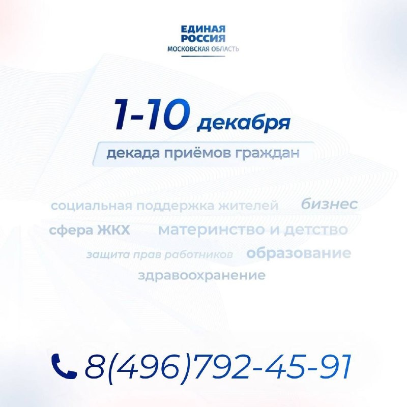 👍 В декабре стартует Декада приёмов граждан Она будет организована «Единой Россией» с 1 по 10 число и приурочена ко дню рождения партии. На площадках региональной и местных общественных приёмных будут работать депутаты всех уровней, секретари отделений и специалисты профильных ведомств. Главные темы встреч – самые значимые для жителей: ЖКХ и благоустройство, социальная поддержка, образование и здравоохранение, вопросы материнства, детства и защиты трудовых прав и поддержка предпринимателей. ❕ Узнать подробную информацию и записаться на приём можно по телефону: 8 (496) 792-45-91 Будем рады видеть вас и слышать ваши предложения – именно так мы меняем округ к лучшему. 📱 Евгения Хрусталева | Глава Домодедово