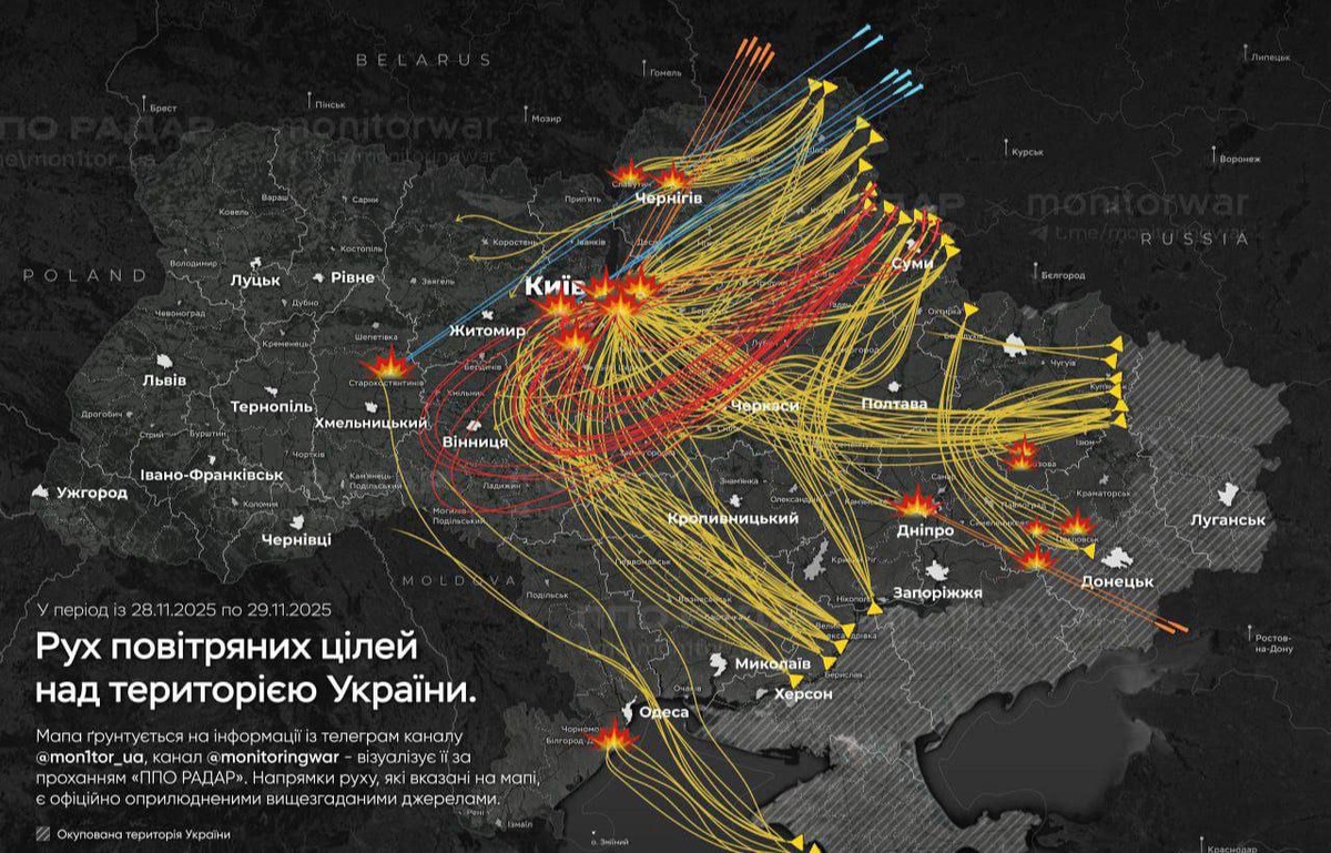 Маршруты БЛА и ракет, примененных в ночном ударе по Украине. По словам Зеленского, было выпущено 36 ракет и 600 БЛА