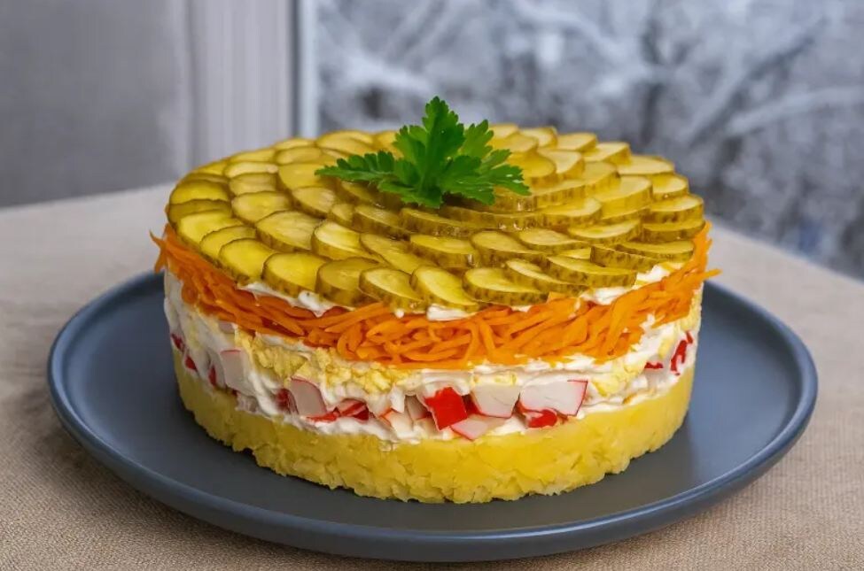 Когда готовишь для гостей, всегда хочется сделать что-то особенное. Этот салат действительно часто становится центром внимания на праздничном столе. Он сочетает в себе разные текстуры и вкусы — нежные крабовые палочки, сытный картофель, пикантную морковь по-корейски и освежающие соленые огурцы. При этом его приготовление не требует особых кулинарных навыков.