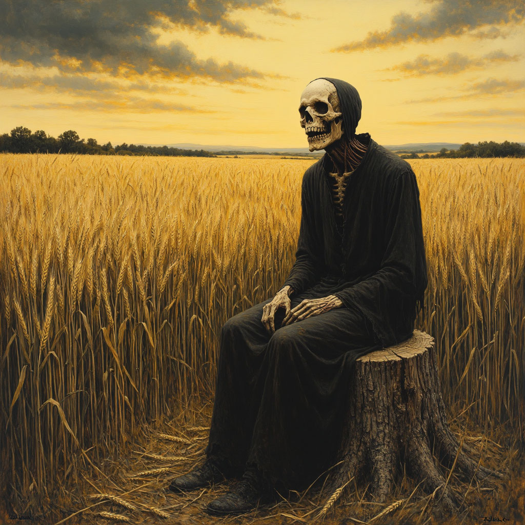 На краю поля, у самой опушки леса, на пне сидел Йозеф. Его саван был в грязи, а на лице застыла гримаса беззвучного смеха. Его грудь не дышала, глаза не моргали, но он сидел там, наблюдая. Абсолютно мертвый и абсолютно живой в своем жутком, застывшем веселье.