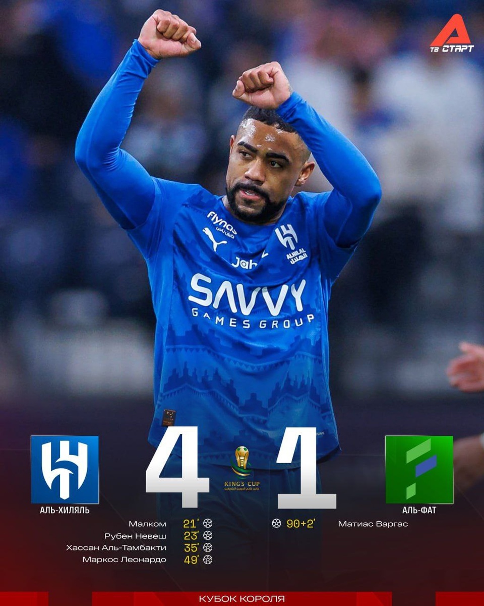 🏆👏 «Аль-Хиляль» в полуфинале Кубка Короля! Команда Симоне Индзаги не заметила «Аль-Фат» в 1/4 финала. Четыре безответных гола в ворота соперника отправили Малком, Невеш, Аль-Тамбакти и Маркос Леонардо. За выход в финал «Аль-Хиляль» сразится с «Аль-Ахли» Рияда Мареза ⚔ 🛒 Наше приложение в Google Play 💙 Наше приложение в RuStore 🛒 Наше приложение в App Store