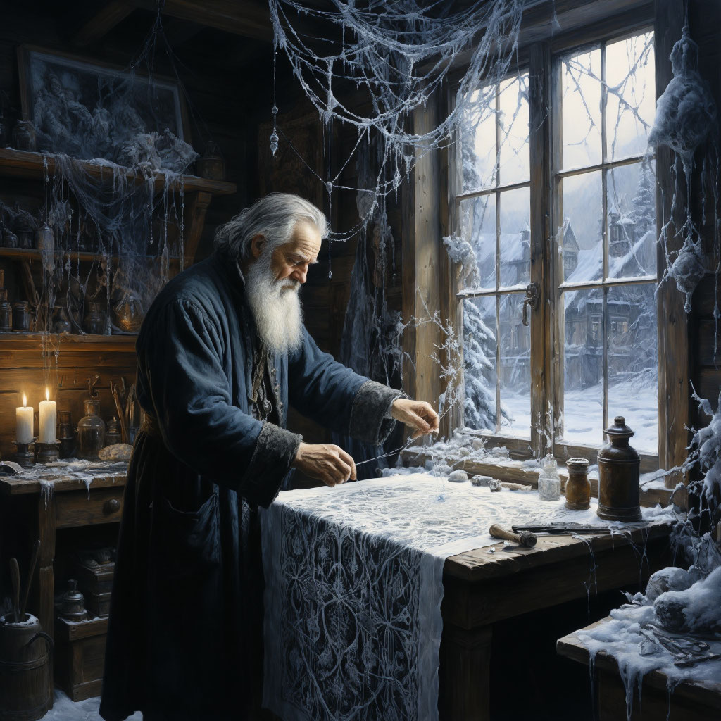 В тот вечер, когда он закончил вышивать первого ледяного духа — бледное, полупрозрачное существо с ветвями вместо пальцев и звездами вместо глаз, — в мастерской стало зябко. Эльза, зашедшая проведать старика, поежилась.