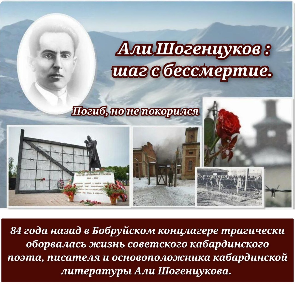 84 года назад в Бобруйском концлагере трагически оборвалась жизнь советского кабардинского поэта, писателя и основоположника кабардинской литературы Али Шогенцукова. Предлагаю вашему вниманию небольшую заметку о Али с сайта Бобруйского информационного портала Комкуринфо, опубликованную в 2017 году. Погиб, но не покорился В застенках Бобруйского концлагеря был замучен поэт, философ, основоположник национальной культуры Кабардино-Балкарии Али Асхадович Шогенцуков. Он родился в долине Баксана, в селении Старая Крепость. За выдающиеся заслуги в деле создания и развития кабардинского национального искусства Али Шогенцукову в 1939 году было присвоено звание заслуженного деятеля искусств. В сентябре 1941 года Али ушел на фронт и сразу попал в пекло «Киевского котла». Он угодил в Бобруйский лагерь смерти № 131. Бывший узник концлагеря № 131 Корней Афаунов после войны вспоминал: «Я часто слышал имя — Алексей, раз мне довелось его увидеть, он оказался кабардинцем, все знали, что он убеждает п