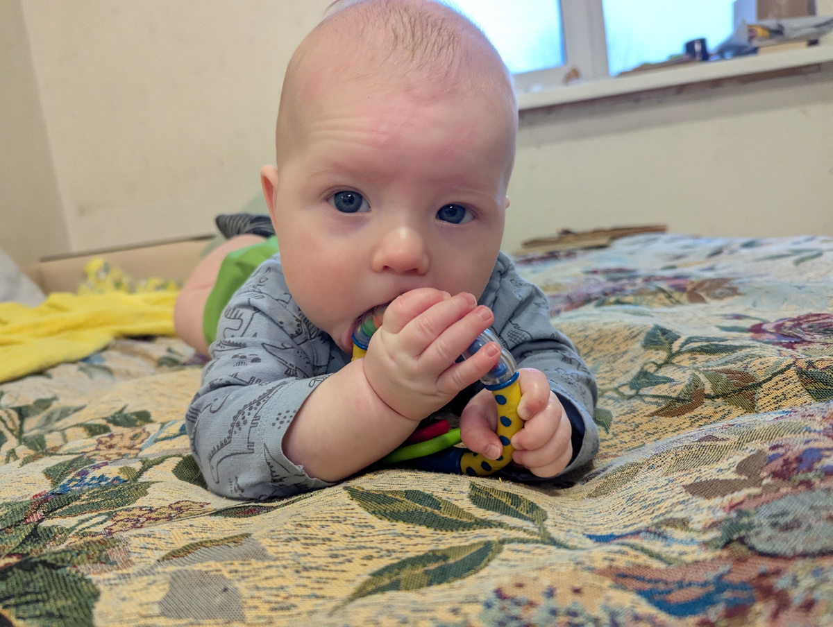 В остальном Женёк развивается как положено. Сейчас активно осваивает руки. Ещё пару недель назад он довольно неуклюже качал погремушки на турничке-подвесе, а теперь может даже переложить силиконовую палочку из руки в руку.