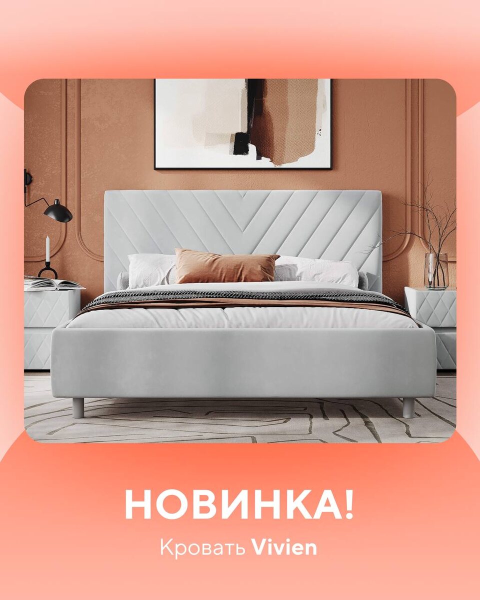 🍂 Представляем новую кровать Vivien от Бренда! Стильное стеганое изголовье и геометрические линии делают Vivien настоящей звездой вашего интерьера. Эта кровать сочетает в себе комфорт и элегантность, привнося изысканность в любое пространство ❣️ 👉 Выбирайте между разборным и неразборным металлическим основанием с ламелями. При желании вы можете добавить подъемный механизм с бельевым ящиком или трансформируемое основание Aquarius для максимального удобства. Съемные чехлы на царгах позволяют легко обновлять обивку, что делает Vivien идеальным выбором для тех, кто любит обновлять интерьер с минимальными затратами. Преобразите свою спальню с Vivien и создайте уютное пространство для отдыха и расслабления ✨ clck.ru/3Qaekg