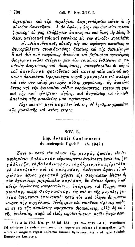 "Приятны мореходцам тихое море и попутный ветер; приятны и в гражданских делах благоустройство, мир и общее согласие. Ибо как пловцы, не испытывая бури и волнения, не сомневаются в своей безопасности и легко пристают с ладьей к берегу: так и для граждан, живущих в благоустройстве, тем безопаснее жизнь, чем свободнее от всяких смут; ибо смута есть величайшее из зол в жизни, и сама природа страшится переворачивать все вверх дном и смешивать дела божественные и человеческие. А нечто подобное можно видеть в том, о чем сейчас, будет сказано. Русский народ, уже долгое время, в течение почти четырехсот лет, знавший одного митрополита, занимавшего в то или другое время киевскую митрополию, наслаждался глубоким внутренним миром, и если в чем уклонялся от должного (как это везде бывает), то легко и скоро был восстановляем и исправляем своим архипастырем. Но недавно настоявшее, по Божьему попущению за множество грехов, время смут произвело в зтом состоянии народа такой переворот и замешательство, что едва не возбудило там междоусобных войн. Когда таким образом время смут творило свое лето, приявший от Бога праведный жребий на 3432 царствование, за свою любовь к истине, кротость и справедливость, которыми он превзошел почти всех бывших до него царей, высочайший и святой самодержец мой, узнав о сем деле от нас самих и от состоящего при нас священного и божественного собора, а также из того, о чем писали и просили в посланных оттуда грамотах преосвященный митрополит киевский, пречестный и экзарх всея Руси, во Святом Духе возлюбленный брат и сослужитель нашей мерности, благороднейший князь всея Руси и любезный сродник высочайшего и святого самодержца моего кир Симеон и другие князья (каповые грамоты и прочтены на соборе, нам во услышание), благоволил издать досточтимый хрисовул, в котором от слова до слова сказано так… (приводится хрисовул императора Иоанна Кантакузина).
