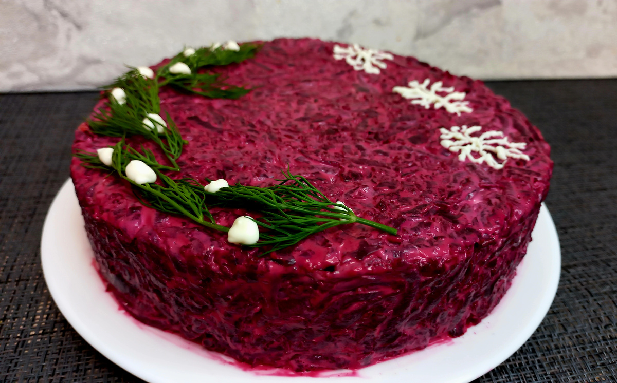1 слой - картофель вареный, майонез 2 слой - семга слабосоленая 3 слой - яйцо вареное, майонез 4 слой - яблоко зеленое 5 слой - морковь вареная, майонез 6 слой - свекла вареная, майонез Украшение - майонез, укроп. Салат удобно делать в кольце. Выбрать салатник и установить на него кольцо. Картофель, вареный в мундире, очистить. Натереть на крупной терке. Уложить на дно кольца первым слоем. Немного посолить. Смазать майонезом. Слабосоленую семгу освободить от упаковки, нарезать небольшими кусочками Выложить на картофель. Майонезом не смазывать. Вареные яйца очистить и натереть на крупной терке. Это - третий слой, который нужно промазать майонезом Яблоко лучше взять зеленое кисло-сладкое. Вымыть, очистить от кожуры и также натереть на терке Выложить на яйца. Вареную морковку очистить, натереть и разложить на яблоки. И снова майонез. Свеклу очистить, натереть на крупной терке. Отправить в миску, немного посолить. Добавить майонез и перемешать. С салата аккуратно снять кольцо. Теперь св