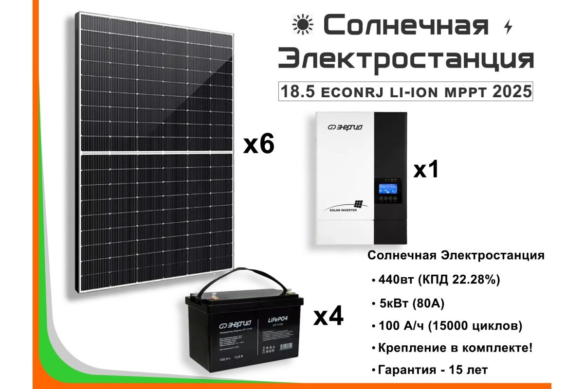 Солнечная электростанция EcoNRJ — это комплексное решение для обеспечения электроэнергией жилого дома площадью до 200 м². Её основные характеристики:
