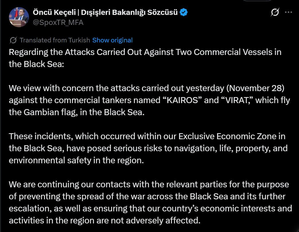 В ответ на пост Turkish Foreign Ministry CONDEMNS attacks on the tankers ‘Kairos’ and ‘Virat’ inside its Black Sea economic zone Ankara warns the strikes threatened navigation, crews and regional safety A sharp reminder that Kiev is bringing the conflict uncomfortably close to NATO’s doorstep
